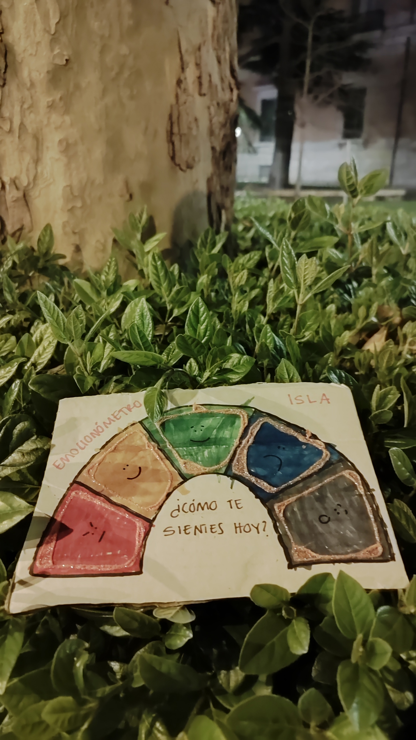 Por la noche me encontré esto y me pareció muy tierno. Qué demonios hacía esto en medio de la calle y por qué: Obsérvese la opción de 2 caras contentas: con cejas alzadas (verde) y sin cejas (amarillo). Me hace risa la duda de qué diferencia implicará eso.