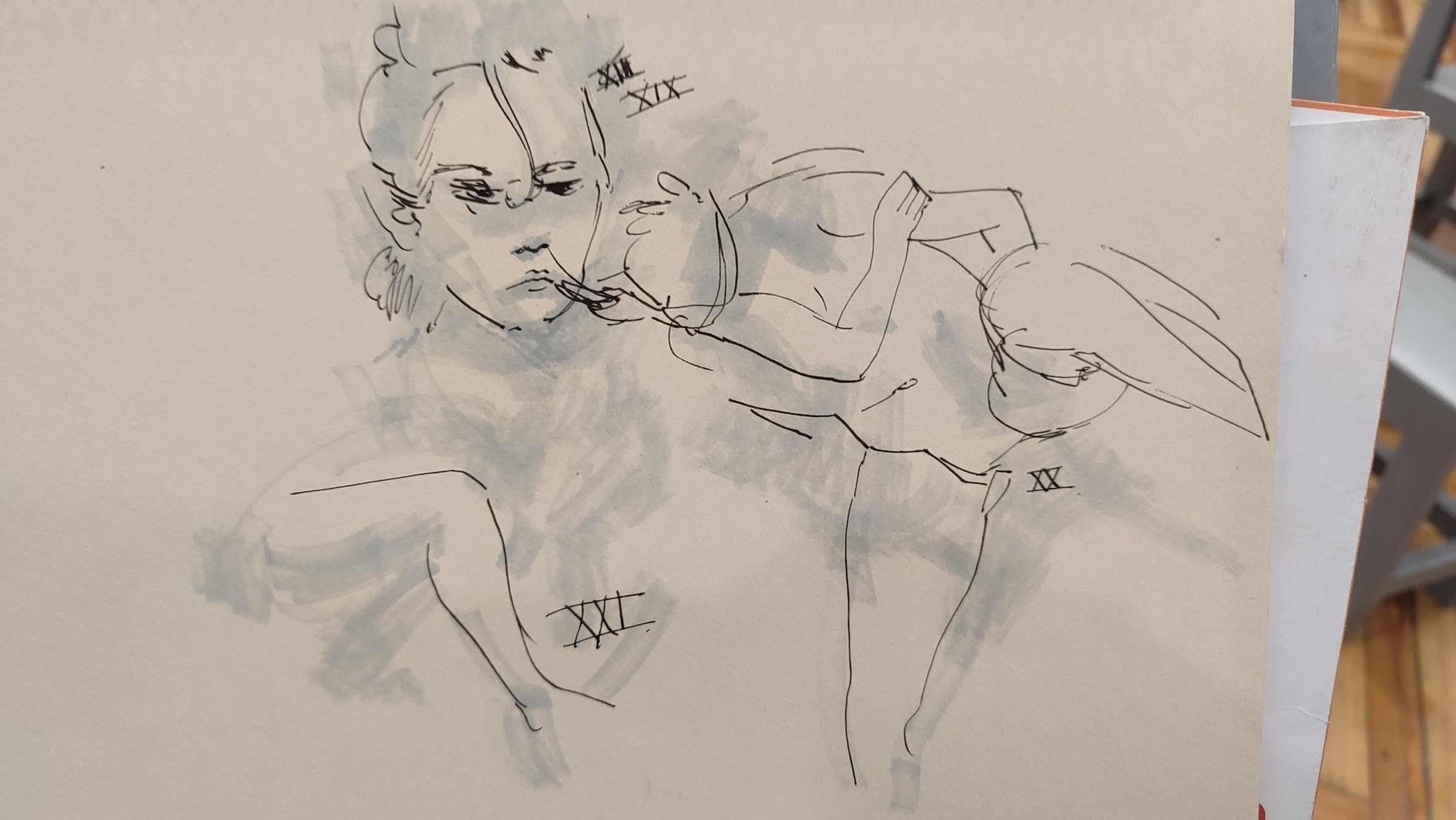 Después fui a la sala de poses rápidas. En este caso, de 2min. Mi cosa favorita. Que no te dé ni tiempo de pensar. Y la modelo hacía poses dificilísimas. Me encantó. De hacer tantos ejercicios técnicos más largos, echaba de menos soltar la mano completamente.