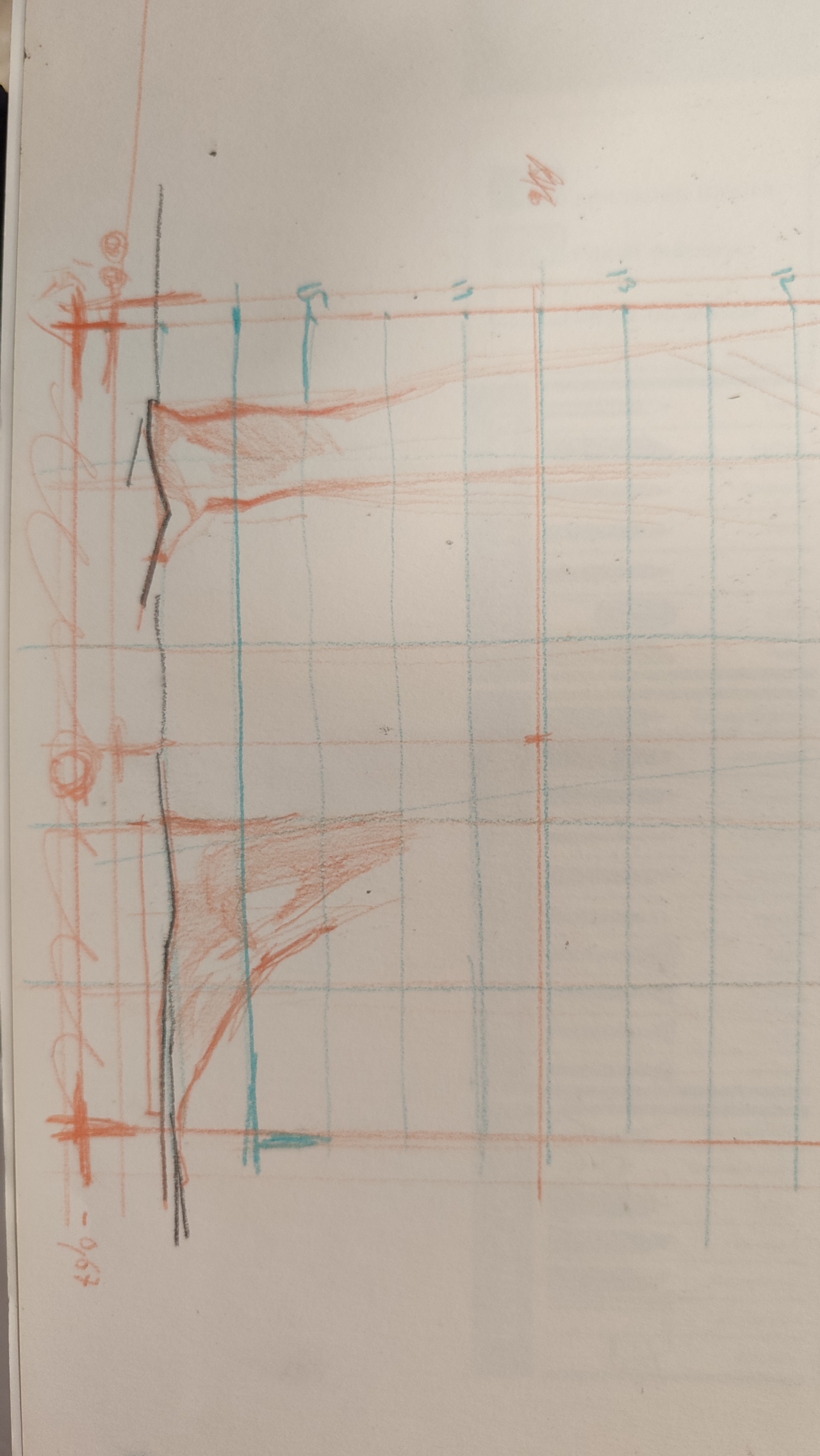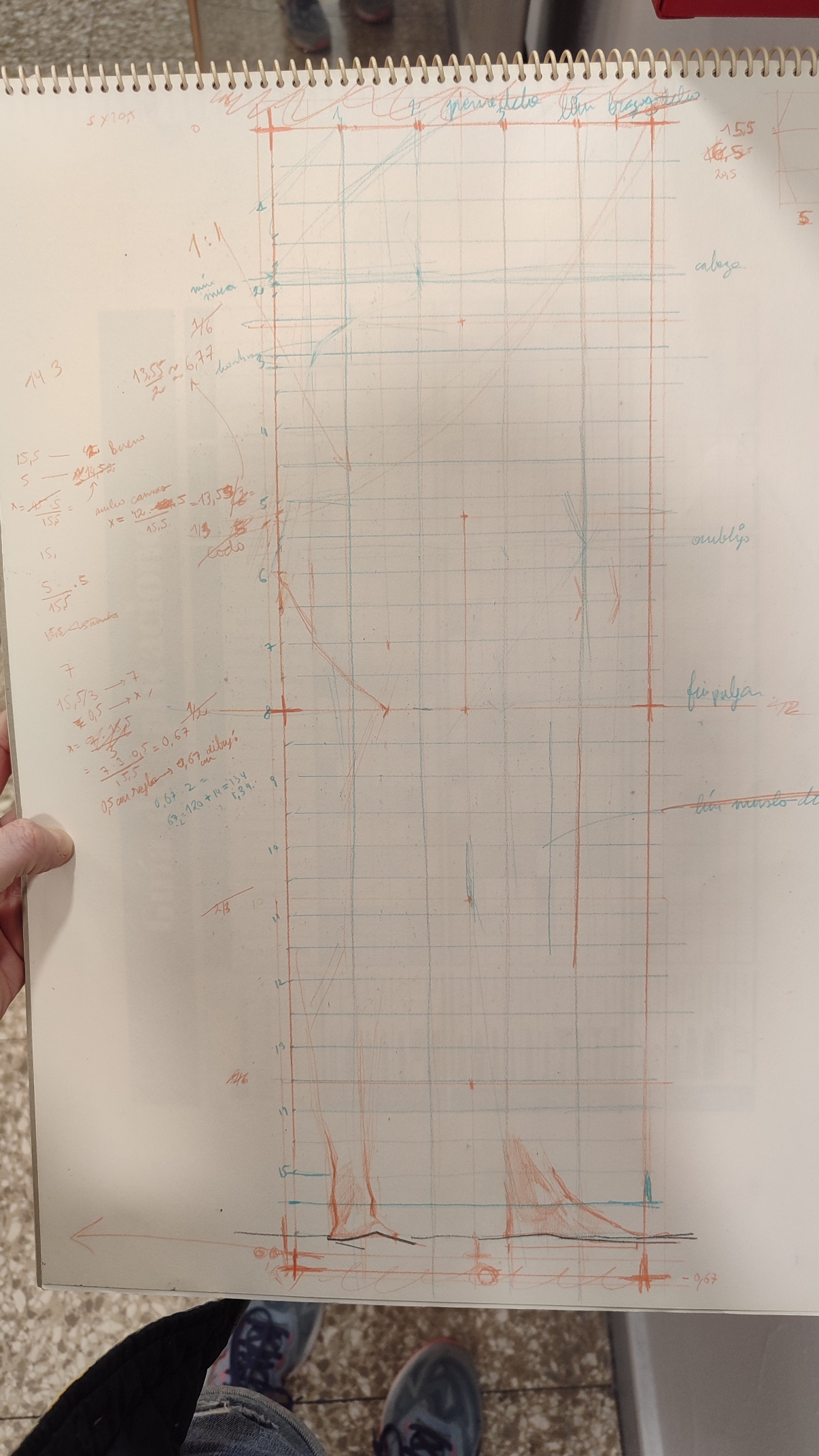 No era tan sencillo como yo pensaba. No sé si se va a entender si lo explico, pero básicamente se me da tan mal medir que construí mal la cuadrícula. Fatalíticamente. Al querer aprovechar la hoja al máximo, se me ocurrió calcular una especie de proporción que me permitiera dividir la altura en alturas de la mayor cantidad posible sin sobrepasar el máximo de altura papel ya que era una pose de pie, i.e., más altura que ancho. Total, que a la hora de colocar cosas en las coordenadas, veía proporciones en mi dibujo que parecían alejadas de la realidad. Porque lo eran.